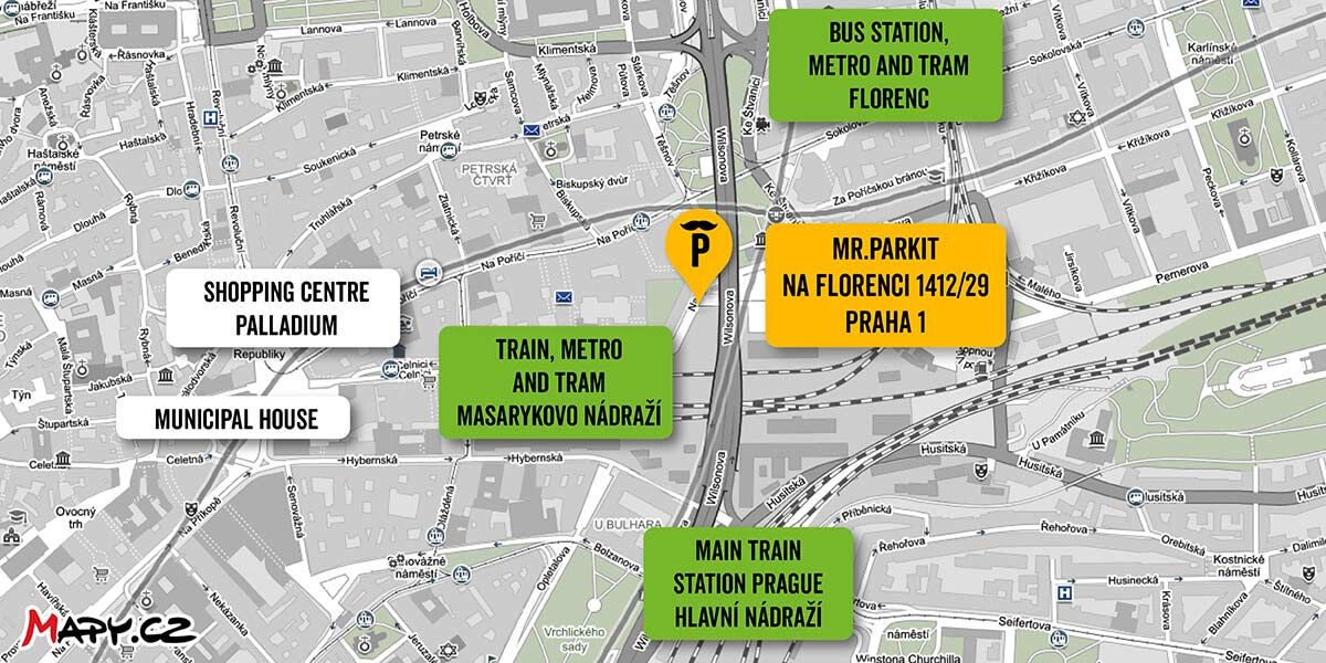 - Metro Florenc (linka B a C) / Tram a Bus Florenc - pouze 1 minutu chůze od garáže.